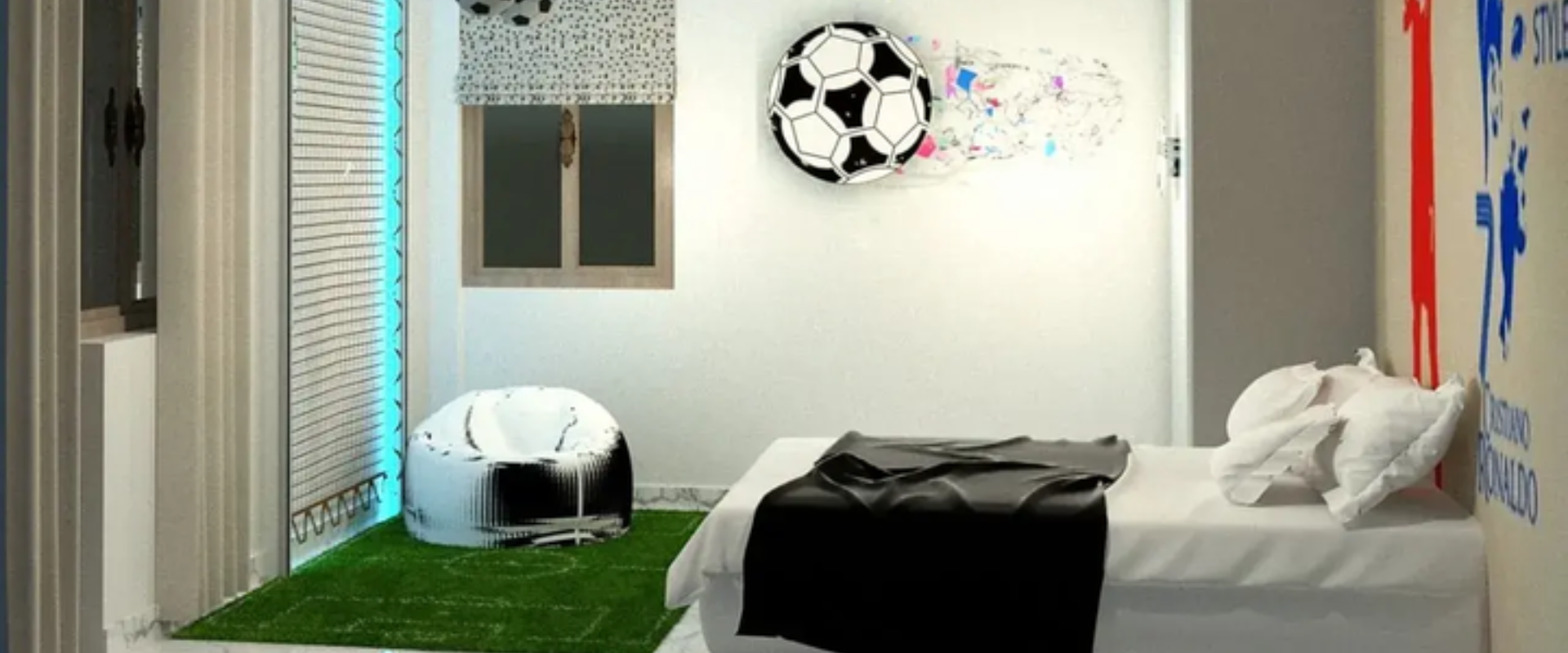 The football theme permeates every aspect of the room’s decor and layout, from the vibrant wall colors resembling a football pitch to the football-shaped furniture and decor elements that adorn the space. The goal was to create an environment that not only reflects the boy’s current passion but also provides a versatile and adaptable setting that can evolve as he grows older.